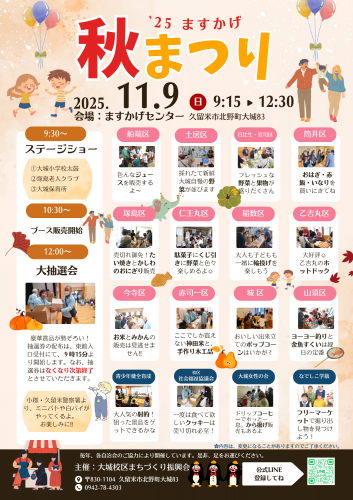 実りの秋を楽しむ「'25ますかげ秋まつり」の季節になりました!地域の新鮮な農産物や秋の味覚、ステージ発表や子ども向けのゲームコーナーなど、家族みんなで楽しめる催しが盛りだくさん。地域の皆さんの笑顔とふれあいがあふれる一日です。秋の風を感じながら食べて、見て、参加して、心あたたまる時間を過ごしましょう。